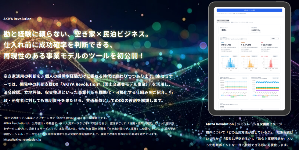 エンジョイワークスより2026年2月末にリリースしたDXツール「AKIYA Revolution」を活用して、空き家を収益事業にしていくための実践セミナーです。#新しい不動産業研究所の会員様を対象に、先行セミナーを開催します。